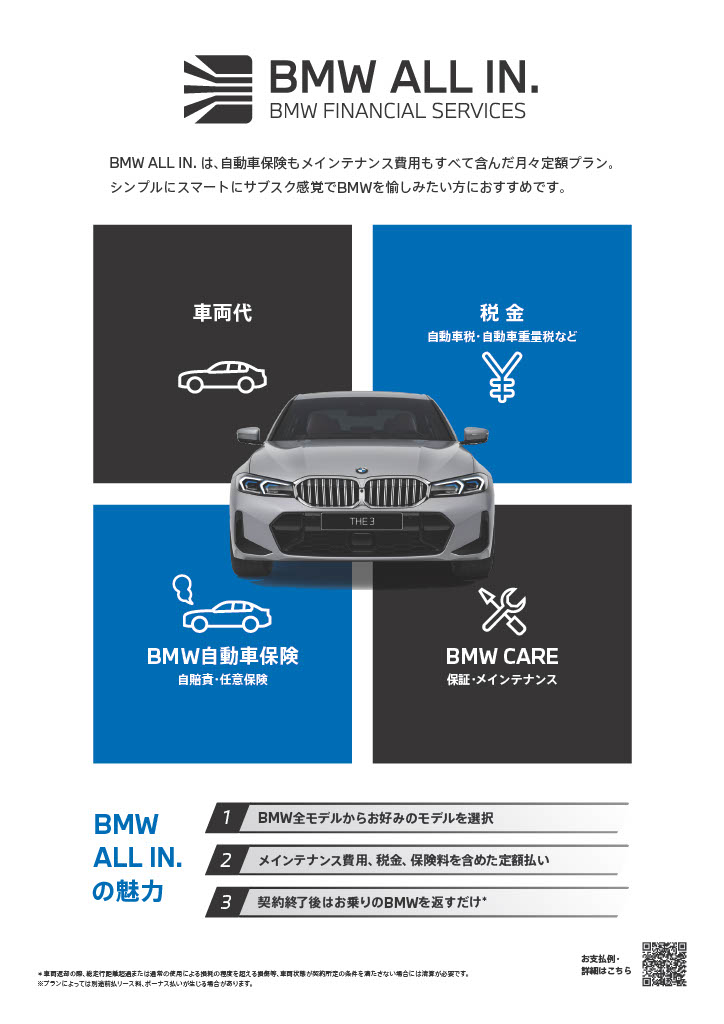 2025年6月より、BMW全モデルを対象に、車両リース、車両メインテナンスから保険・税金などが1つのパッケージとなったサブスク型プラン「BMW ALL IN.」をスタートしました。